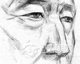 人像素描基礎知識:碳鉛筆的優點是濃黑,可以很快地表現特殊的素描關系;缺點是只有一種型號,明度的深淺完全由繪畫者控制,而且不易擦幹淨,容易把畫面弄"髒"。局部步驟...較瘦的老人形象,最便于我們理解球形眼,長方形鼻這類