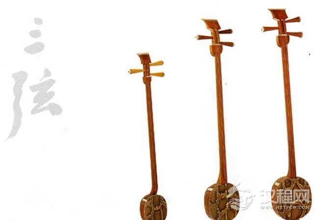 在北京的故宫博物院里,收藏有一件紫檀木制的大三弦,全长97.8厘米。琴鼓椭圆形,用匏制成,正面蒙以蟒皮为面,状如龟盘,琴鼓长17.5厘米、边厚7.2厘米。琴头扁 铲形,长16.3厘米,上部较宽并向后弯曲,下部中间开有通底弦槽,两侧设有三个紫檀木弦轴(左一右二),轴长7.8厘米。琴杆为半圆柱状体,杆长63.2厘米、上宽2.4厘米、下宽3厘米。琴鼓尾端有象牙制爪扣系弦,并垂有一束彩色丝穗为饰。这件三弦选料考究、装饰精美,不仅琴鼓侧面刻有串枝莲纹饰,还在匏制的琴鼓背面雕刻出美丽的奏乐画面,其图像为四仕女分别手持笙、笛、箫、板等乐器,在山竹间演奏,纹饰清晰,构图生动。此琴为清宫旧藏,制作年代不详,曾在清代宫廷宴乐的“番部合奏乐”中使用。?