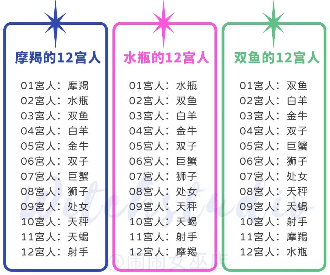 假设你是一个白羊座(上升or太阳),我们便将白羊座当作你的第1宫,那么逆时针数一格,金牛座就是你的第2宫,金牛座就是白羊座的2宫人,而双子座是白羊座的3宫人,依次类推,双鱼座是白羊座的第12宫人。